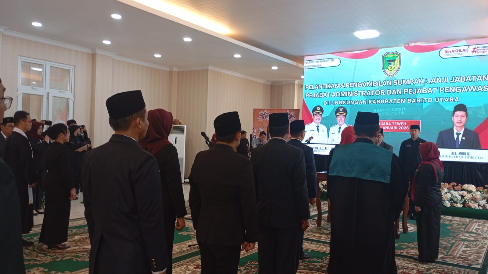 Bupati Barito Utara Shalahuddin melantik dan mengambil sumpah pejabat administrator dan pengawas di lingkungan Pemkab Barito Utara di Aula Rumah Jabatan Bupati Setempat, Jumat (30/1/2026).