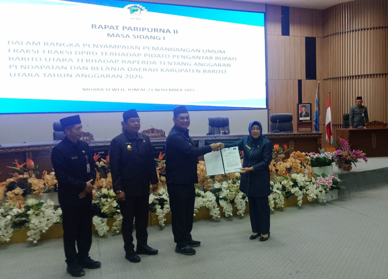 Hal ini disampaikan dalam Rapat Paripurna II DPRD Barito Utara yang digelar pada Kamis, 21 November 2025, dengan agenda penyampaian pemandangan umum fraksi-fraksi DPRD terhadap pidato pengantar Bupati mengenai Raperda APBD 2026.