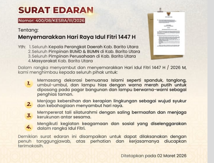 Ajakan tersebut tertuang dalam Surat Edaran Bupati Barito Utara Nomor 400/08/KESRA/III/2026 yang dikeluarkan oleh Bupati H. Shalahuddin. Melalui surat edaran itu, pemerintah daerah mengimbau seluruh perangkat daerah, BUMD, perusahaan, hingga masyarakat untuk turut berpartisipasi memeriahkan momen hari kemenangan umat Islam.