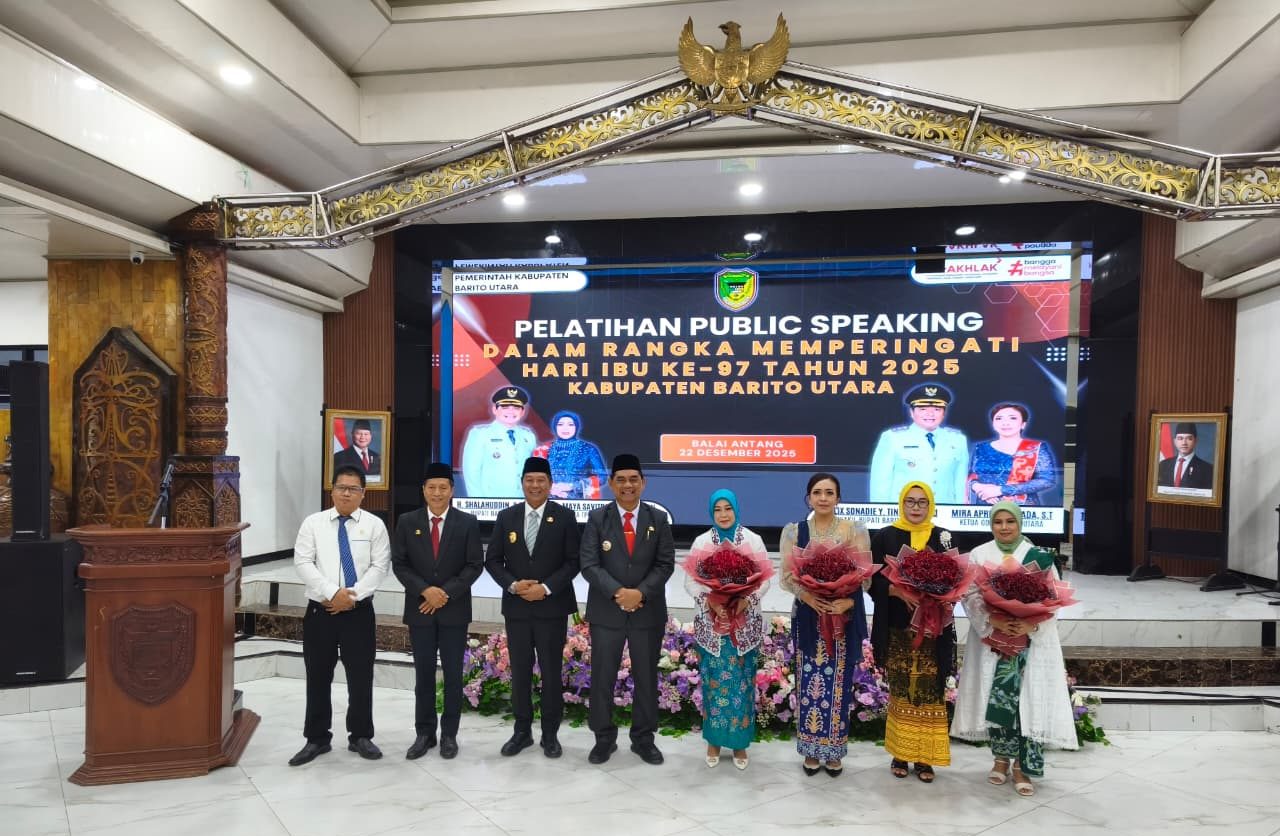 MUARA TEWEH – Pemerintah Kabupaten Barito Utara terus mendorong penguatan peran perempuan sebagai agen perubahan pembangunan daerah. Momentum tersebut diwujudkan melalui Pelatihan Public Speaking dalam rangka Peringatan Hari Ibu ke-97 Tahun 2025, yang secara resmi dibuka oleh Bupati Barito Utara H. Shalahuddin, Senin (22/12/2025).