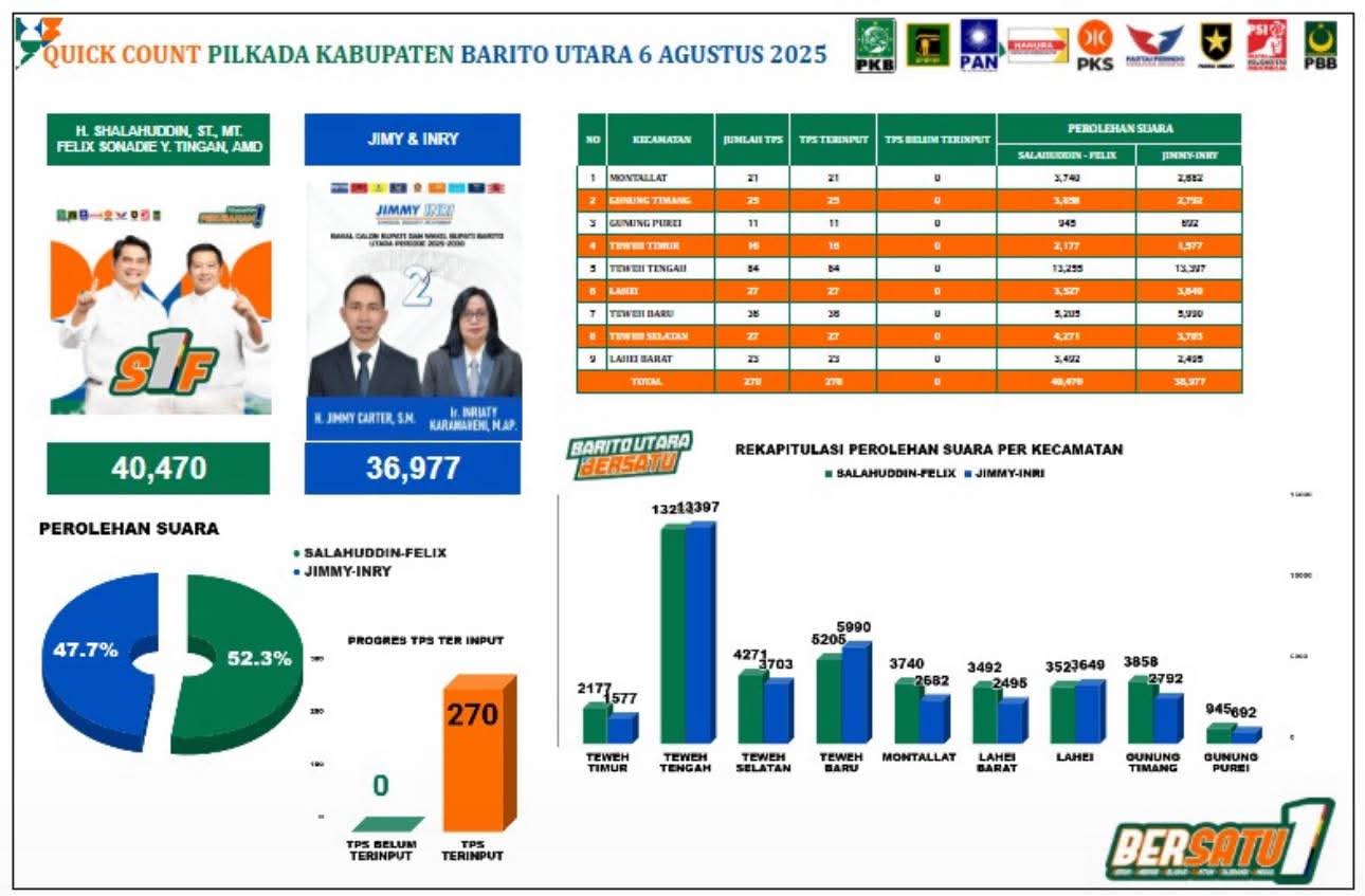 Pemungutan Suara Ulang (PSU) Pilkada Barito Utara yang digelar pada 6 Agustus 2025 menjadi ajang pembuktian bagi pasangan calon nomor urut 01, Shalahudin–Felix. Pasangan ini berhasil unggul dan mengamankan kemenangan dengan selisih suara cukup lebar atas rivalnya, Jimmy-Inry.